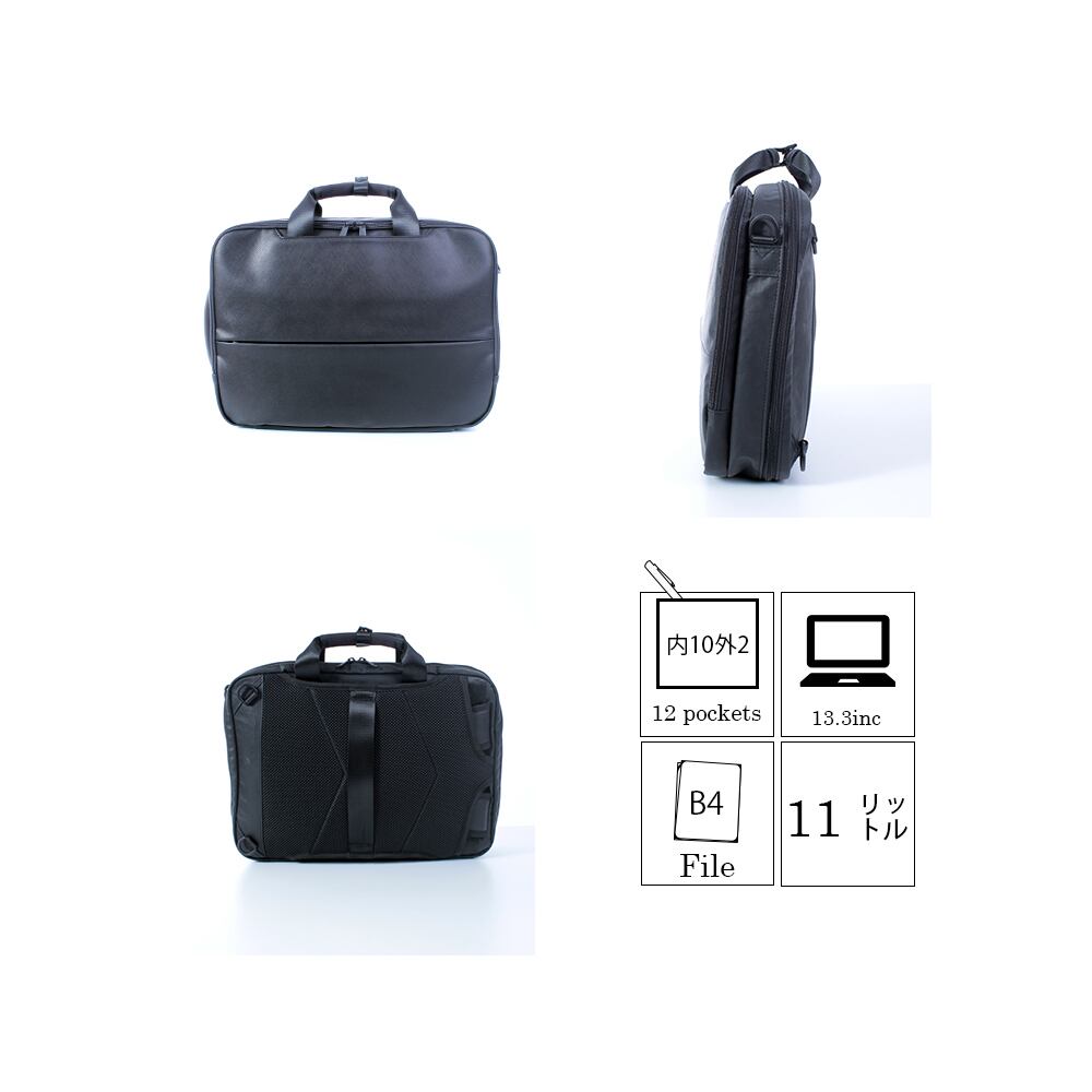 ビジネスでもカジュアルでも使える、定番のスクエアデザインで機能性も抜群の持ち手収納3WAYバッグです。本体素材はサフィアーノ合皮で撥水力もあり上品なラグジュアリー感のある機能的な素材で、ファスナーは高品質なYKK撥水ファスナーを使用し、水に強い仕様です。正面のファスナーポケットは雨傘などを収納していただけるようなデザインで、部分的にこのポケットの裏地は水に強い仕様で他ルームを守ります。トップのハンドルはネオプレーンを巻いていて持ち心地も抜群です。また、収納が出来るポケットも付いているのでリュックとして背負った時の見た目をよりシンプルにスッキリさせることが出来ます。フロント側のルームは、パカっと開いて収納しやすく、【メッシュポケット×2】【オープンポケット×2】【ペン差し×2】とポケットも多く仕分けも簡単です。メインルームはキャリーバッグの様にがばっと開くことの出来る仕様で、ブリーフ持ちでもリュック持ちでも出し入れしやすい様に【ウレタンポケット×1】には二か所にマジックテープが搭載されています。視認性の高い【メッシュポケット×2】と貴重品などを入れるのに便利な【ファスナーポケット×1】もあるので収納力抜群のアイテムです。サイズ調整が出来て取り外し可能なショルダーベルトも搭載されています。背面はメッシュ仕様になっていて、通気性もあり背負い心地も良いです。またキャリーケースにリュックとしてもブリーフとしても簡単に搭載可能な仕様になっており、出張や旅行のお供にもご利用いただけます。肩ベルトはチェストベルト付属されていて、サイズ調整も出来る仕様です。Dカンも搭載されているので家の鍵や、小物類を付けてご利用いただけます。またこの肩ベルトは下部のナスカンを取り外していただいて収納できるような仕様にもなっております。抜群の収納力で機能性もあり、素材からデザインに至るまでこだわり抜かれた商品を是非お試しくださいませ。